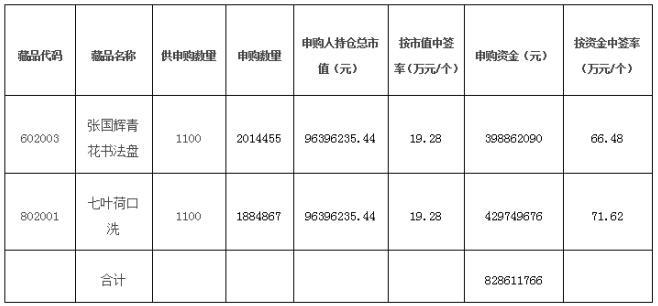 本次中簽分配方式為45.45%按持倉市值分配,54.55%按申購資金分配,請廣大參與申購的交易會員關注交易賬號中持倉數量和資金變化情況?!稄垏x青花書法盤》、《七葉荷口洗》將于2017年4月8日正式掛牌交易。